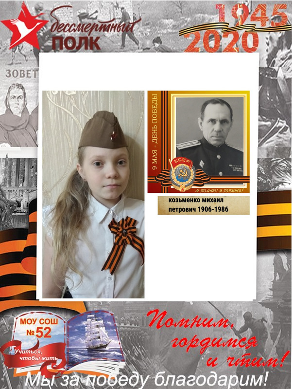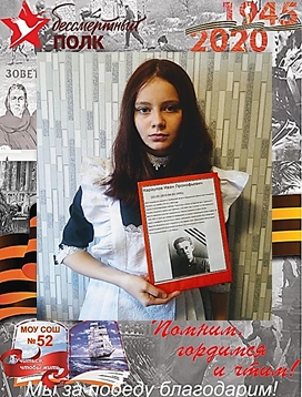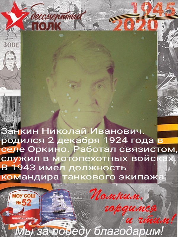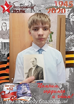Скорблюк Анастасия 8а. Мой прадедушка родился в Тамбовской области Жердевского района село Чикиревка. Поступил на службу в 20 лет в 1943г. Служил в мотострелковых войсках. Участвовал в битве на Курской дуге. Сражался в Польше, Румынии и дошел до Германии. В мае 1945 года в составе 1-го Белорусского фронта принимал участие в сражении за г.Рослау Германии на Эльбе. 4.05.1945г в окоп, где находился прадедушка со своими товарищами попал снаряд. Очнулся он уже в госпитале и без правой ноги. Прадедушку комиссовали домой. За отвагу и храбрость проявленные в боях с немецкими захватчиками был награжден орденом.
