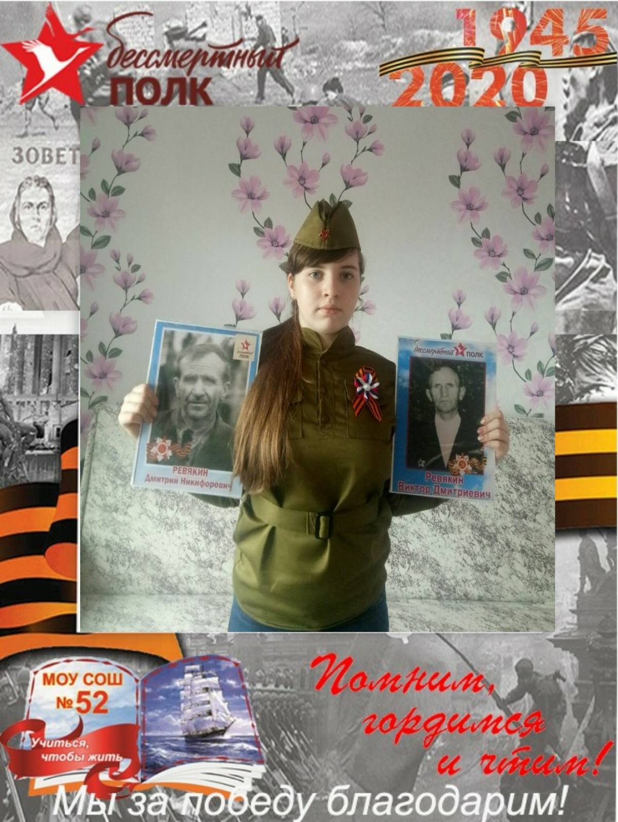 Ефрейтор 737 зенитного полка Белорусского фронта .Был нагдажден за уничтожение восточно- прусской группировки г.Кёнигсберга в 45 году медалью в ВОВ над Германией .А также медалью за боевые действия.Прошёл всю войну ,вернулся живой. Слева ,Ревякин Виктор Дмитриевич - прадед .