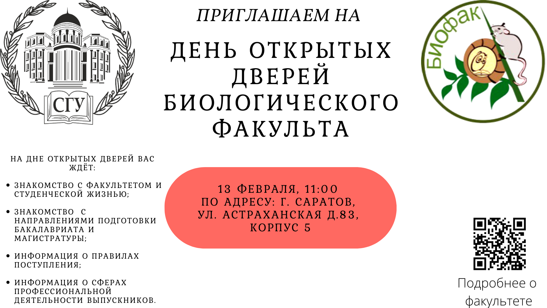 Саратовский государственный университет приглашает обучающихся 9-11 классов принять участие в мероприятии «День открытых дверей на Биологическом факультете», которое состоится 13 февраля 2022 (вс).
