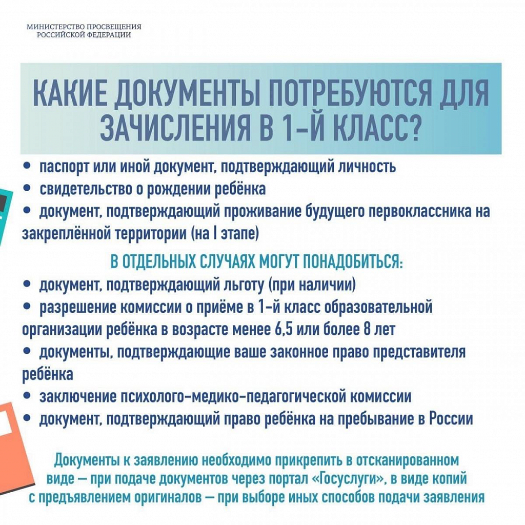 Так же подать заявление в 1 класс можно через портал государственных услуг Российской Федерации (смотреть инструкцию по ссылке:Список документов для приема в 1 класс